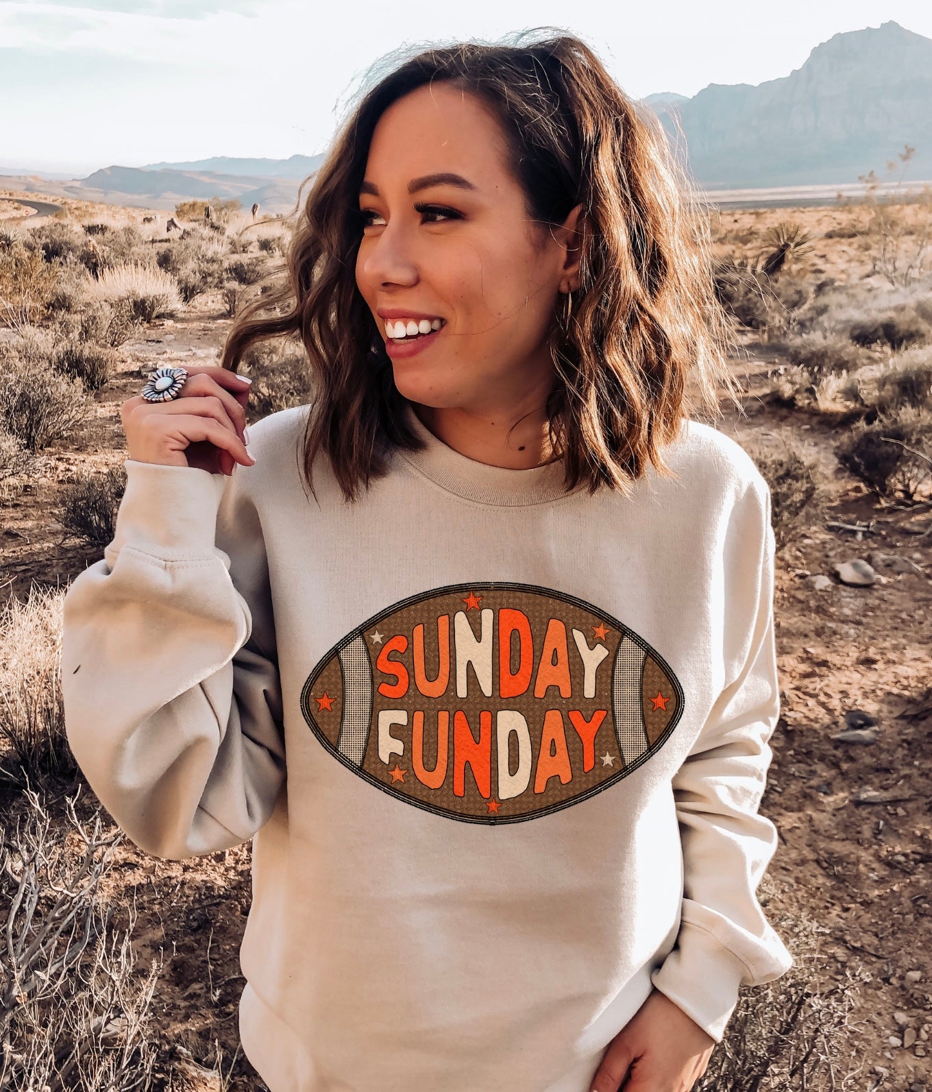 SUNDAY FUNDAY FOOTBALL CREWNECK offers comfort, style and quality with its lightweight design and 100% cotton fabric. It features a ribbed crew neck, long sleeves and a retro football front graphic design – perfect for a Sunday fun day.